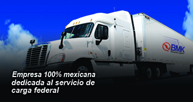 ¿Quiénes somos? Con una experiencia de más de 15 años en el ramo, nace BMK Transporte y Logística S. de R.L de C.V. empresa 100% mexicana dedicada al servicio de transporte de carga federal. Desarrollamos una nueva cultura de servicio, donde nuestro principal objetivo es proporcionarle: seguridad, calidad, profesionalismo, eficacia, tecnología y conocimiento del mercado, para cubrir sus demandas, con altos estándares de calidad y seguridad reconocidos a nivel nacional.